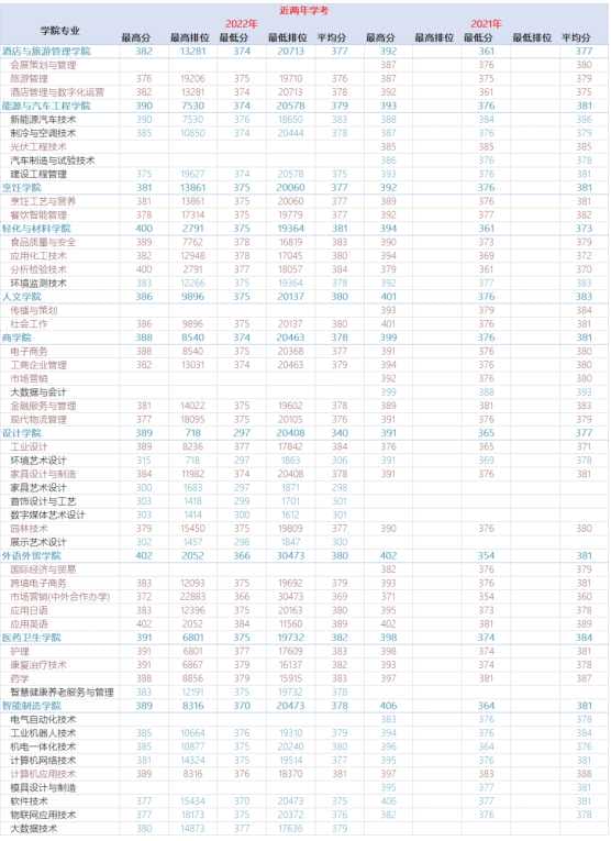 学校设有11个二级学院(智能制造学院、能源与汽车工程学院、轻化与材料学院、医药卫生学院、设计学院、商学院、酒店与旅游管理学院、烹饪学院、人文学院、外语外贸学院、马克思主义学院)。2021年学校招生专业53个,其中国家教育改革试点专业2个、中央财政支持重点专业2个、广东省示范性专业8个、广东省重点专业3个、广东省重点建设专业3个、第一批省级一类品牌建设专业2个、第二批省级二类品牌建设专业5个。